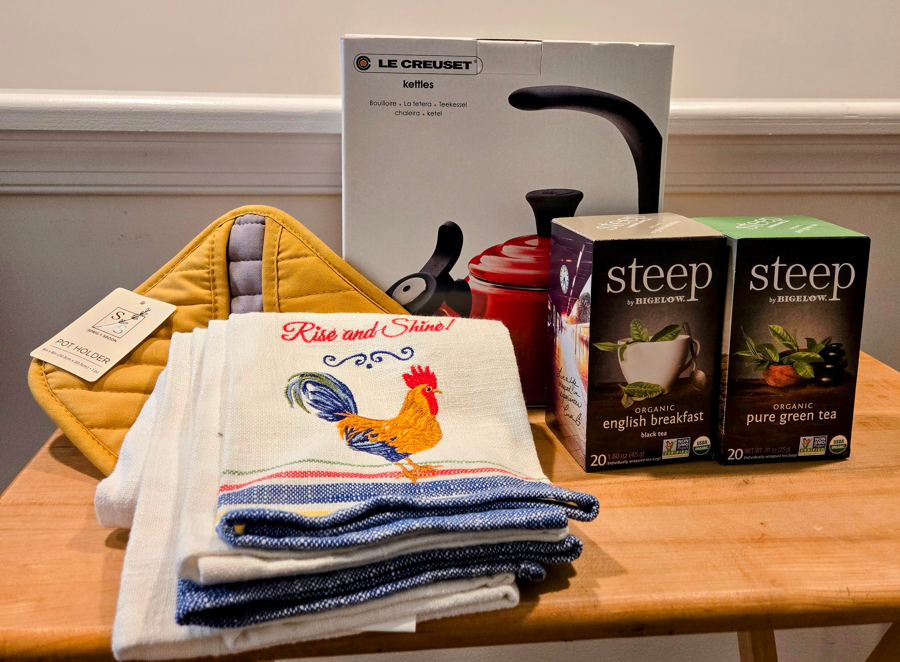 Rise and shine! This basket includes a red Le Crueset Cloche Kettle, dish towels, pot holder, two types of tea, and a $10 gift card to Vigilante coffee. Le Creuset’s first kettle introduction in over a decade, the newly designed Cloche Kettle is crafted from fast-heating premium carbon steel and finished with a colorful enamel in our stylish palette of colors to complement any kitchen. Useful for preparing French press coffee, oatmeal, tea and more, durable carbon steel heats water rapidly, while the halo-style handle stays cool, ensuring easy lifting and a comfortable grip.