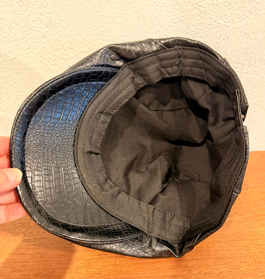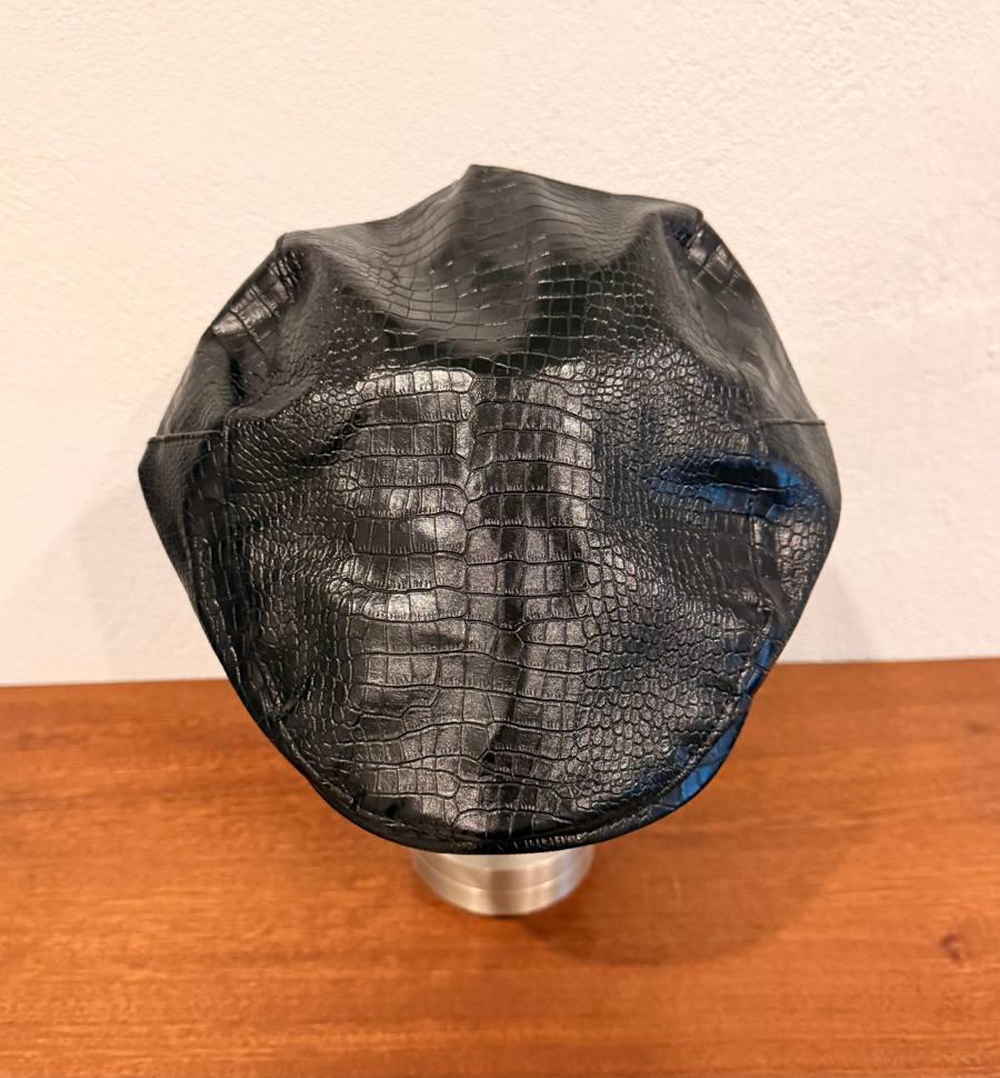 Men's British-style black beret cap in alligator leather with adjustable back clasp, sized 22" (6 7/8). No visible wear inside or out.