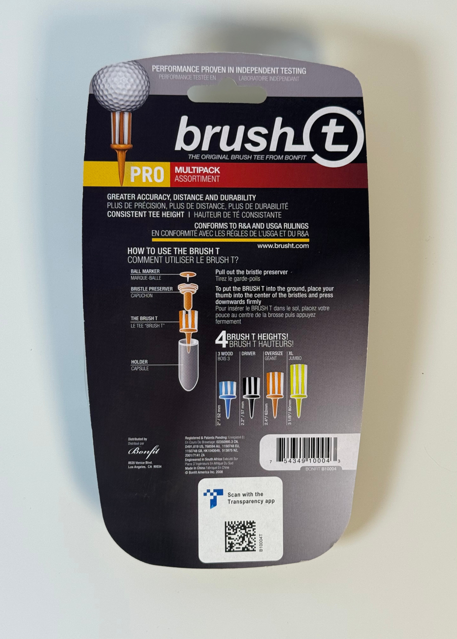 Greater durability and less friction make this set of brush tees an improvement over the usual wood tees. Each tee is designed for greater distance with specific clubs. The set of 4 includes tees for driver, three-wood, hybrid, and jumbo.