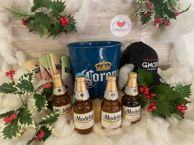 Here is a package of 4 bottles of Modelo Especial, 1 ghost tequila hat, 6 Manita Tequila seltzer coozies, a Corona bucket, and a bottle opener and small towel