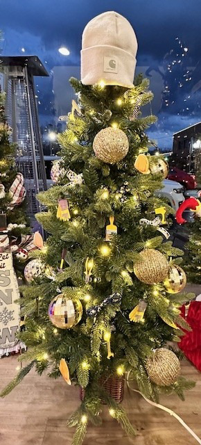 A 4 ft Outdoor Tree covered in construction ornaments. This one is ready for your porch! Comes with a $50 Lowes Gift Card and $50 Cracker Barrel Gift Card