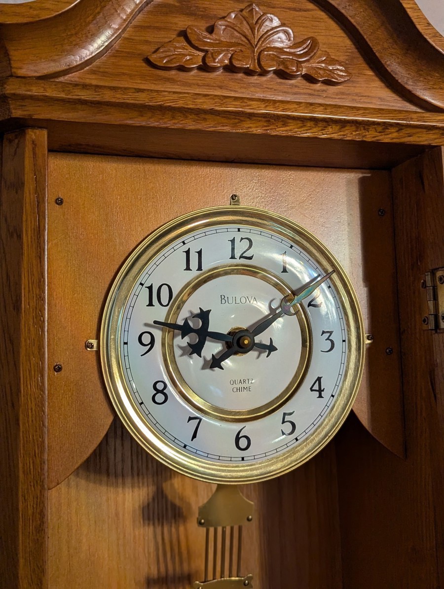 Bulova Quartz Chime Wall Cabinet Clock, valued at ~$250.