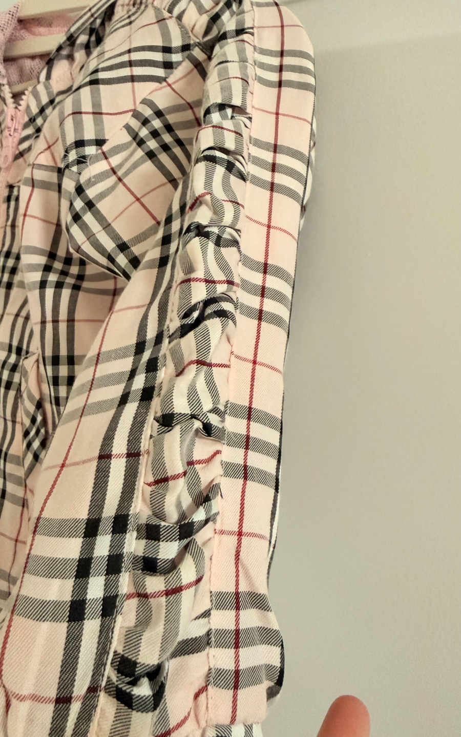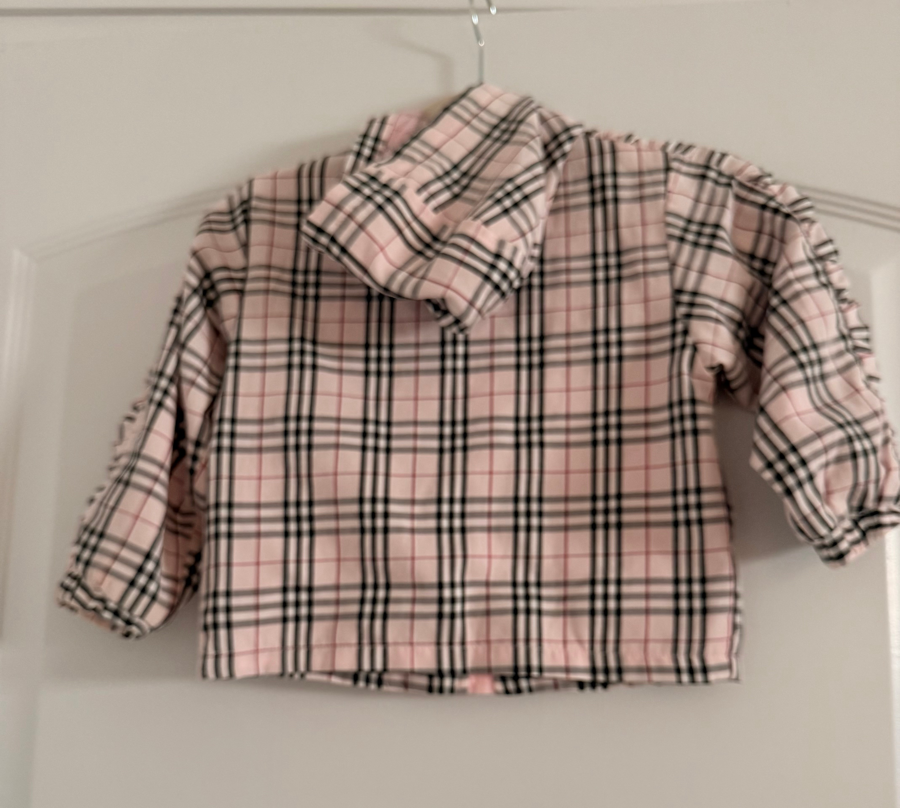 This adorable Burberry toddler jacket is equipped with a sturdy zipper for quick dressing and undressing. It features the traditional Burberry pattern with an added touch of gathering along the sleeves. In addition there are 2 pockets. It is ideal lightweight comfort is perfect as a windbreaker. A great season transitional layer for your active child.