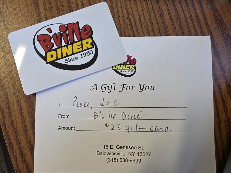 Please note: No refunds or exchanges on auction items. Please do not ask the donor for an exchange or refund. Donors have been generous to donate to PEACE, Inc. for this auction. All gift card/certificates only auction items can be mailed at no cost the winning bidder. All other items (non-gift card/certificate are local pick-up/drop-off only in the Syracuse, NY area.