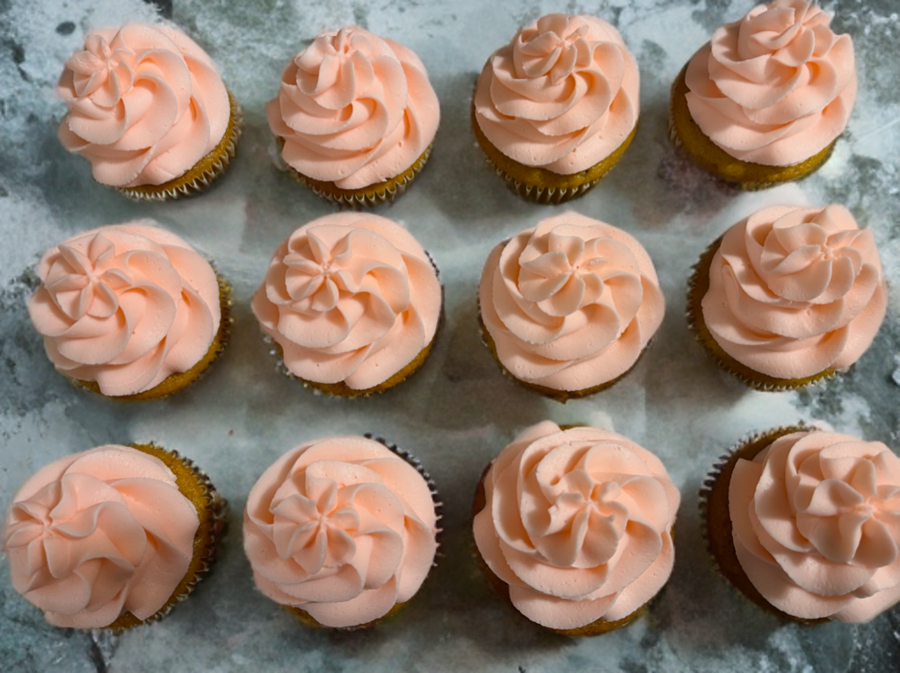 A dozen vanilla cupcakes with peach ring frosting donated by Shawnee Grady