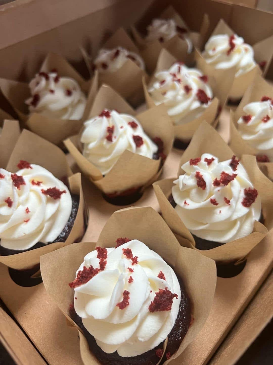 A dozen red velvet cupcakes with cream cheese icing donated by Mullenax Bakery