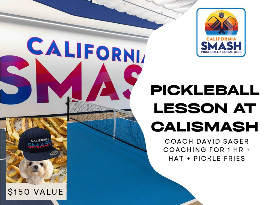 This includes a 1-hour pickleball lesson led by the fantastic David Sager, who is known for his exceptional coaching skills and enthusiasm. As part of this package, you will also receive a stylish hat to show off your love for the game. After or before your lesson, treat yourself to the delicious El Segundo Smash burger, paired perfectly with their unique "pickle" seasoned french fries. Don't miss this chance to enhance your pickleball skills while enjoying great food and fun at CaliSmash!