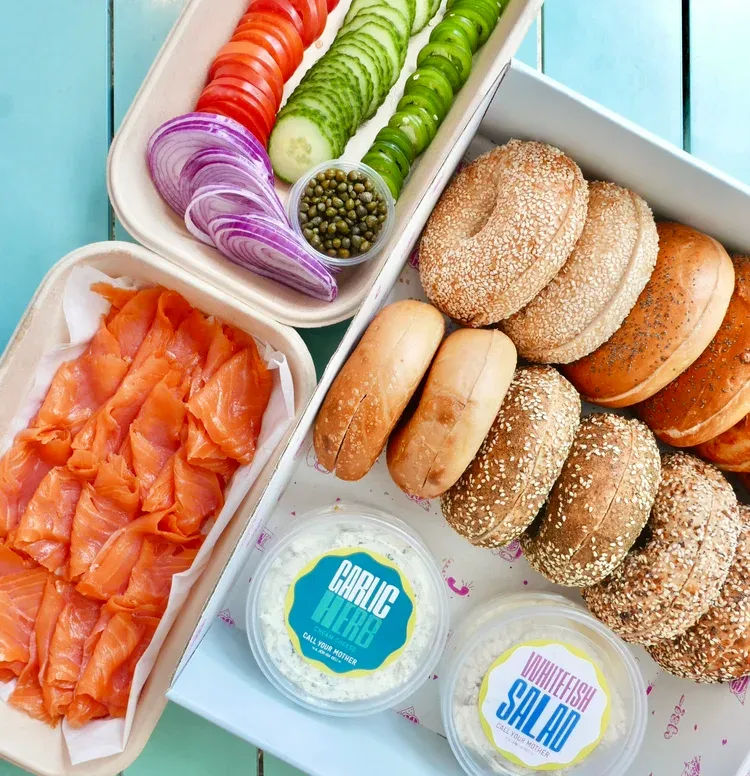 Introducing the Call Your Mother Deluxe Bagel Catering Tray! This exquisite offering features a delightful assortment of 12 fresh bagels paired with a variety of flavorful schmerz, smoked salmon, sliced cucumbers, tomatoes, onions, jalapeños, and capers. Perfect for gatherings, this catering tray comes complete with all the necessary fixings to create your ideal bagel experience. Whether it's a brunch, a corporate event, or a family get-together, this catering tray is sure to impress your guests.