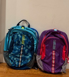 2x CamelBak Scout hydration packs designed for younger explorers. Constructed from durable nylon, this backpack includes a 1.5L Crux reservoir to keep hikers hydrated on the trail. The design incorporates a breathable mesh back panel and shoulder straps for comfort, along with two side mesh pockets for extra storage. A front zippered pocket provides organization for small essentials, while the reflective safety strip adds visibility in low-light conditions.