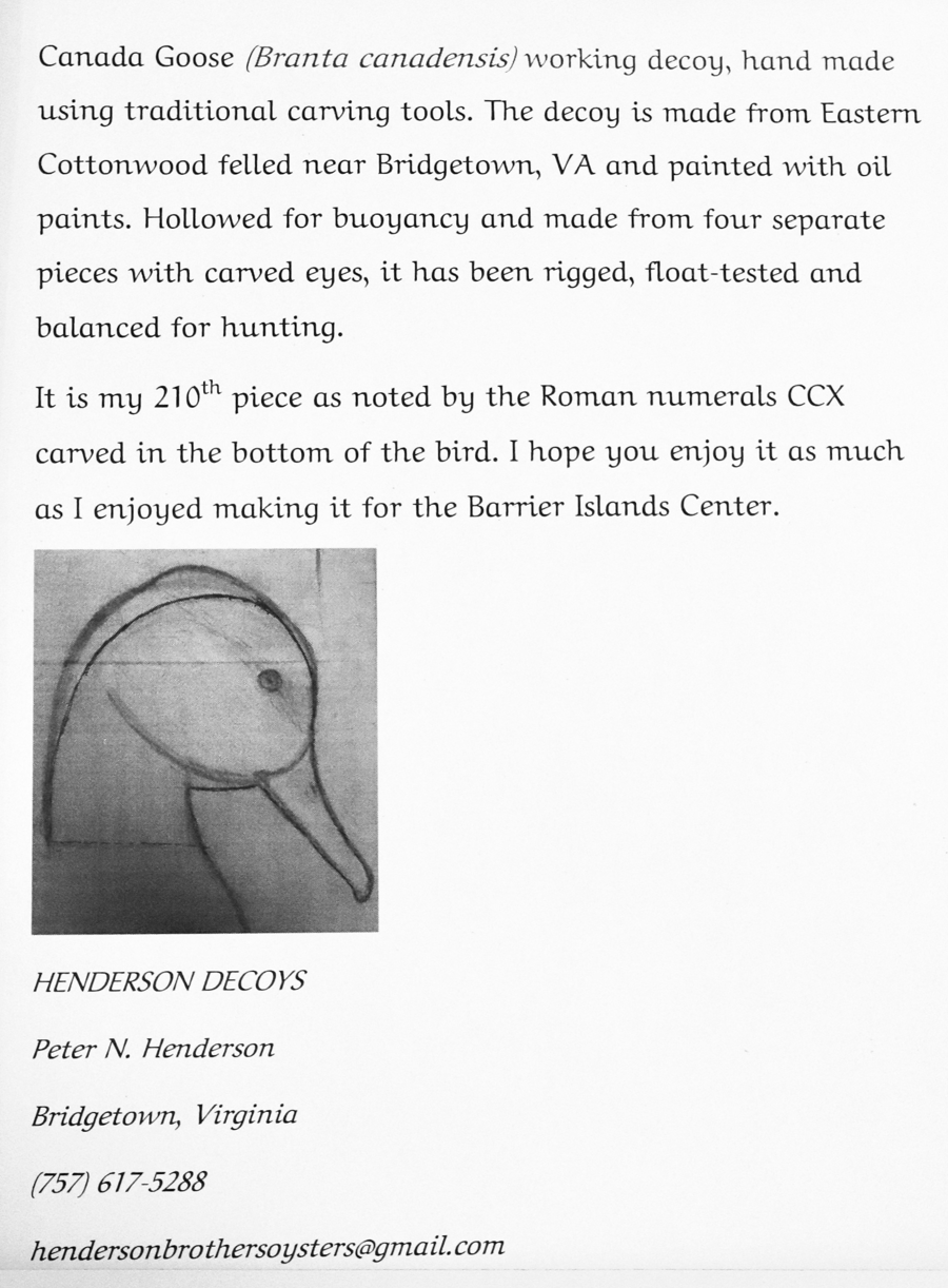 A standout piece of working folk art, this Canada Goose decoy is handmade by Peter Henderson of Henderson Decoys (Bridgetown, Virginia) using traditional carving tools.