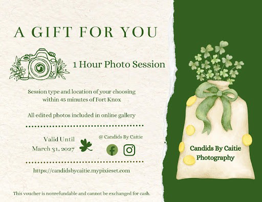1 hr photo session. Winner can choose session type and location within 45 min from Ft Knox. All edited photos will be provided in an online gallery