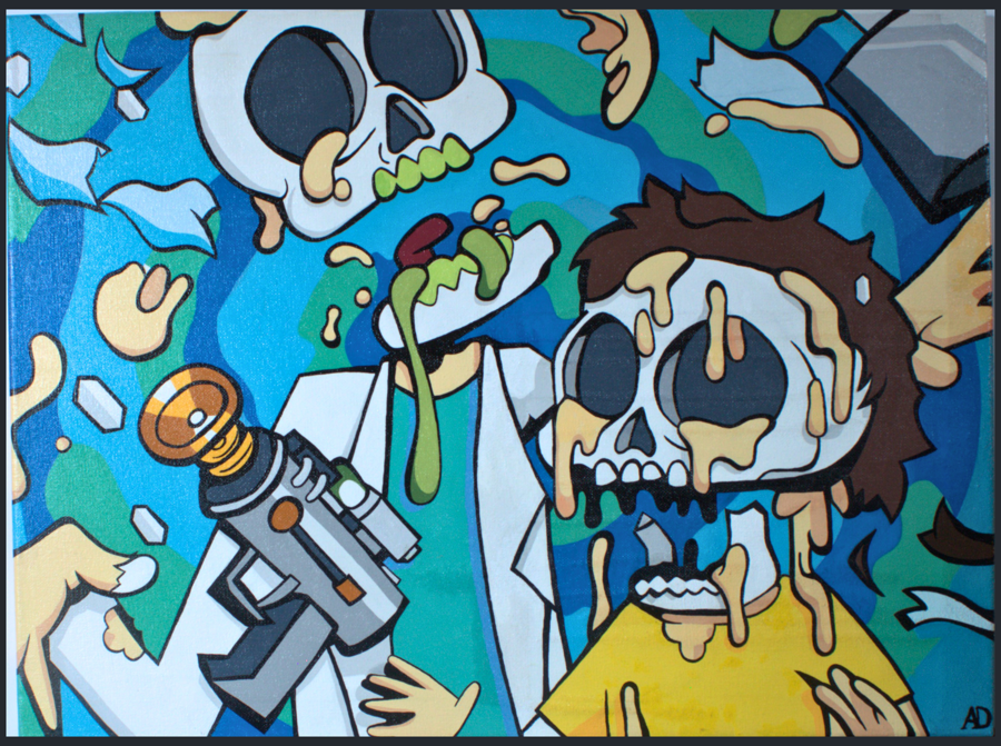 Artist: Allejandra Dunnaway. "A colorful pop art scene capturing a chaotic moment frozen in time. The melting characters represent how quickly moments pass, while the camera symbolizes the memories communities share and capture together. Canvas measures 18 x 24 inches.