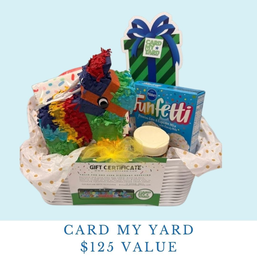 This birthday party package includes funfetti birthday cake mix, plates, mini piñata, and one 24 hour birthday greeting from Card My Yard. Card My Yard is a premier, nationwide yard sign rental service that specializes in custom, personalized greetings for birthdays, graduations, and special occasions. https://www.cardmyyard.com