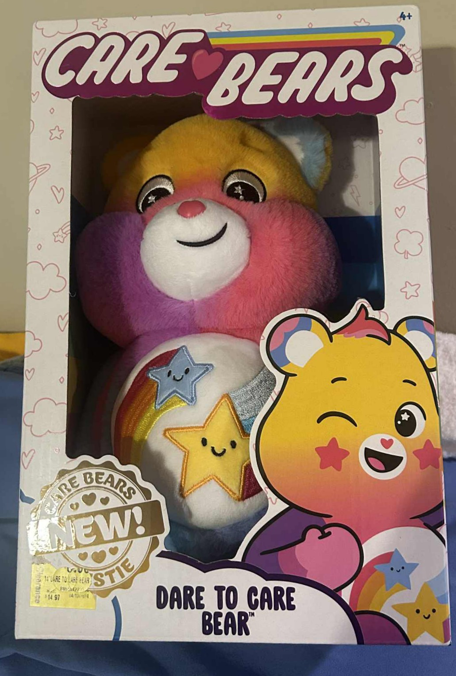 For generations, Care Bears have helped kids express and share their feelings with others. Kids will love Dare to Care Bear and her message of kindness and acceptance! This Dare to Care Bear plush is 14 inches in size - perfect for on-the-go or at-home play. Dare to Care Bear's belly badge featuring two happy, shooting stars reminds us that while we may be different in some ways, we’re also the same in other ways. Kids will love Dare to Care Bear's bright, multicolored fur featuring a mix of blue, orange, purple, and pink colors. The Care Bears Dare to Care Bear plush is made with super-soft material that is fun to hug and snuggle.