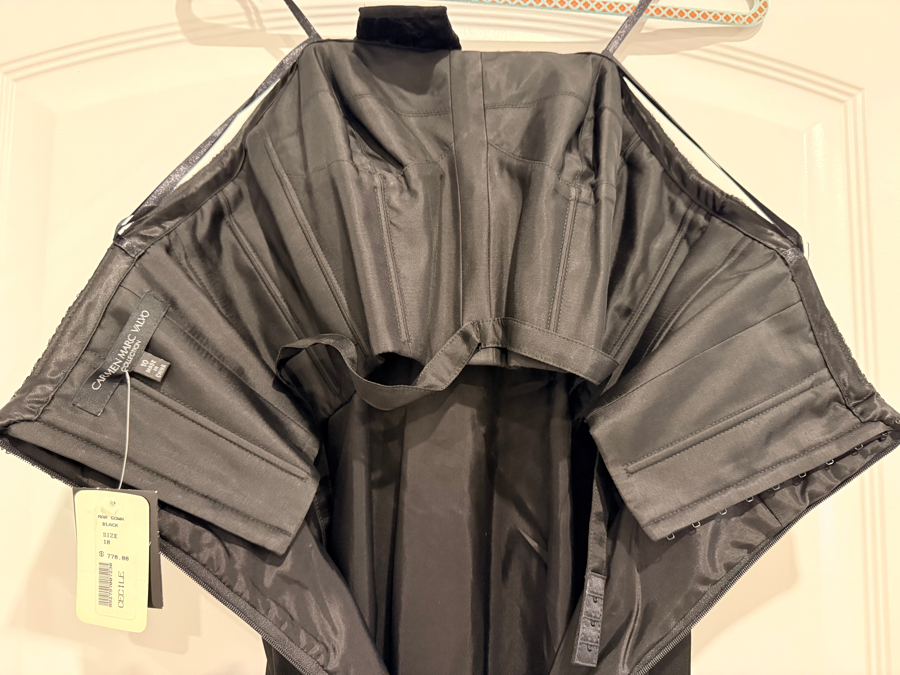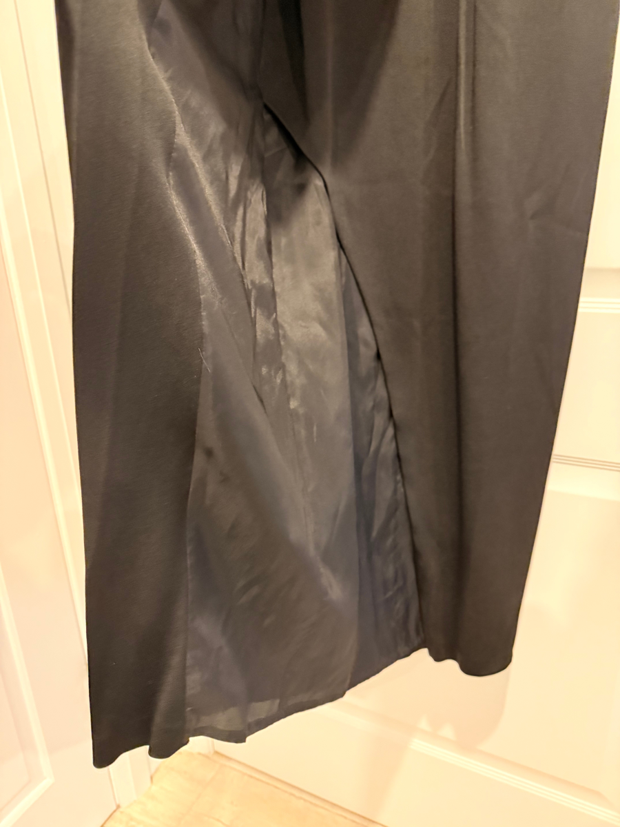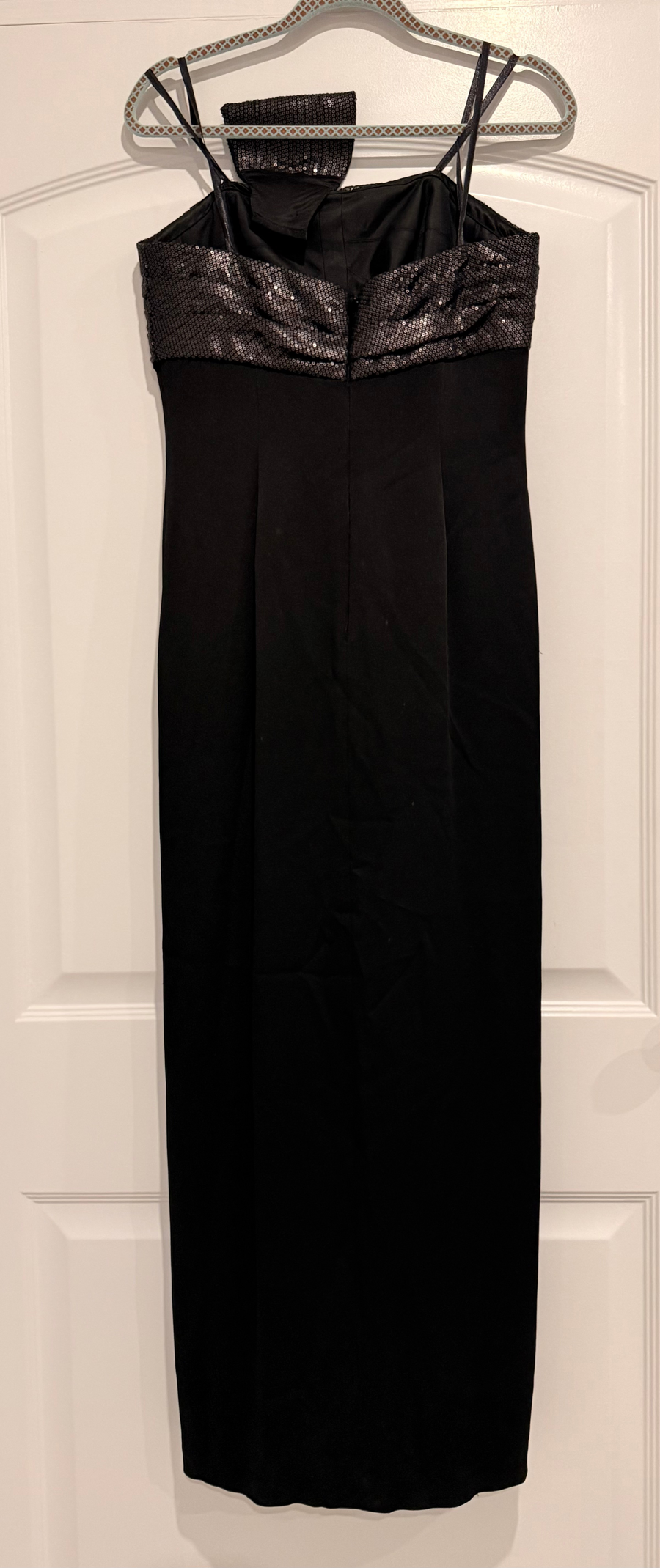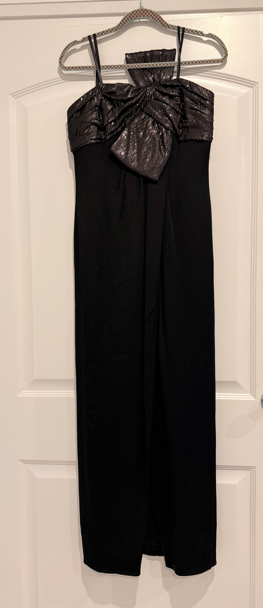 This sleeveless sequin embellished dress is the perfect special occasion evening gown. It has a shimmering black bust detailed bow with a front slit opening on the left side. The dress is fully lined. The bust has clasp fastening with an adjustable strap. Carmen Marc Valvo is an American designer. Color: black Condition: Brand new Size: size 10, length: 49inches, bust: 33.25 inches, waist: 32.5 inches