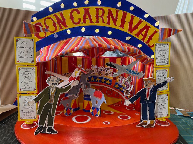 This piece is based on a fiction book written by PT Barnum, a 19th c. entrepreneur/real estate investor/promoter/politician/ and some would add, con man. Sounds like a contemporary someone!! Hence, the origin story of this art work. Note: the signage is illuminated by two battery -powered lights. This piece measures about 18”w x 17”d x 14”h. Mixed media: fabric, mixed papers, watercolor, pen, wood dowels, cork, plastic tubes, stitching, hot glue and mini lights/battery pack.