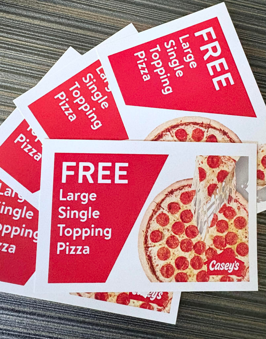 Enjoy five free large single-topping pizzas from Casey's General Store.