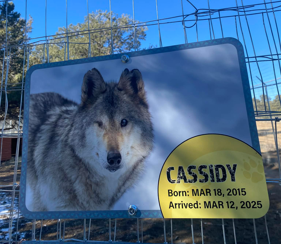 Cassidy was a mid-content wolfdog who came to Wild Spirit along with 21 other animals from Indigo Mountain Nature Center, a fellow wolf sanctuary that shut down in 2025 due to the death of their Founder. She (along with her siblings) spent the majority of her life at Indigo Mountain after being rescued as a baby. As a puppy, Cassidy experienced a slew of health issues including a metabolic bone condition that resulted in extreme bowleggedness in her front limbs, as well as an eye condition that resulted in the complete loss of one eye, and blindness in the other. Despite these conditions, Cassidy conquered life each and every day, sharing every special moment with her lifelong companion, Tahoe, and the humans who loved her dearly. This enclosure sign used to hang on Cassidy's habitat during her life here. It is in great condition and measures approximately 19.2" X 13.2". Our hope is to use the funds made from these signs to purchase new "In Memory" versions.