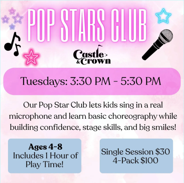 Castle and Crown has established itself in Burbank as a premier creative playspace, with classes, camps, and seasonal events. Try out their Pop Star Club, with this 4 pack of classes. Kids sing in a real microphone, learn basic choreography, while building confidence, stage skills and big smiles! Ages 4-8