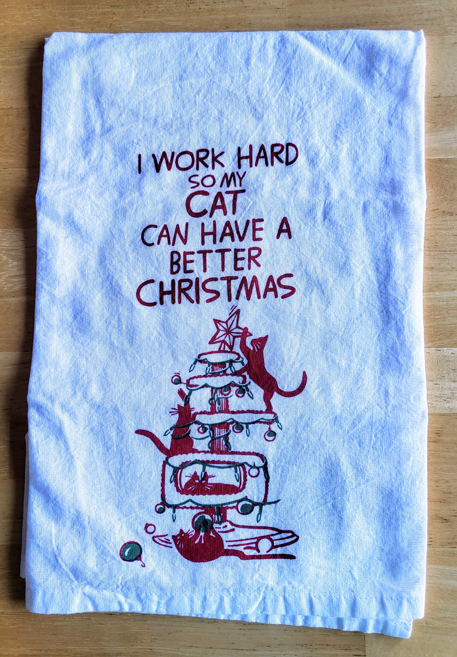 Primitives by Kathy Kitchen Towel - "I Work Hard So My Cat Can Have a Better Christmas" depicts kitties decorating their cat tree. 100% cotton, measures about 28" square.