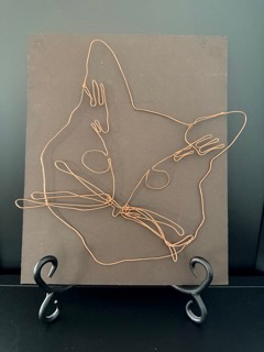 Approx size 10" h x 8" Cute cat portrait created with copper wire against a black backdrop. This unique piece was crafted in jewelry class by Wheaton North student Grace McCurdy. Approx. size is 10" H x 8" W.
