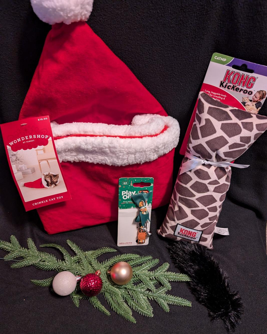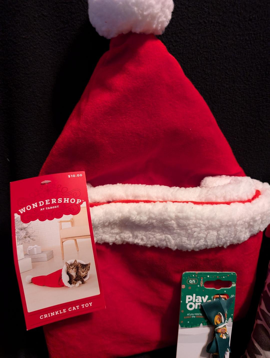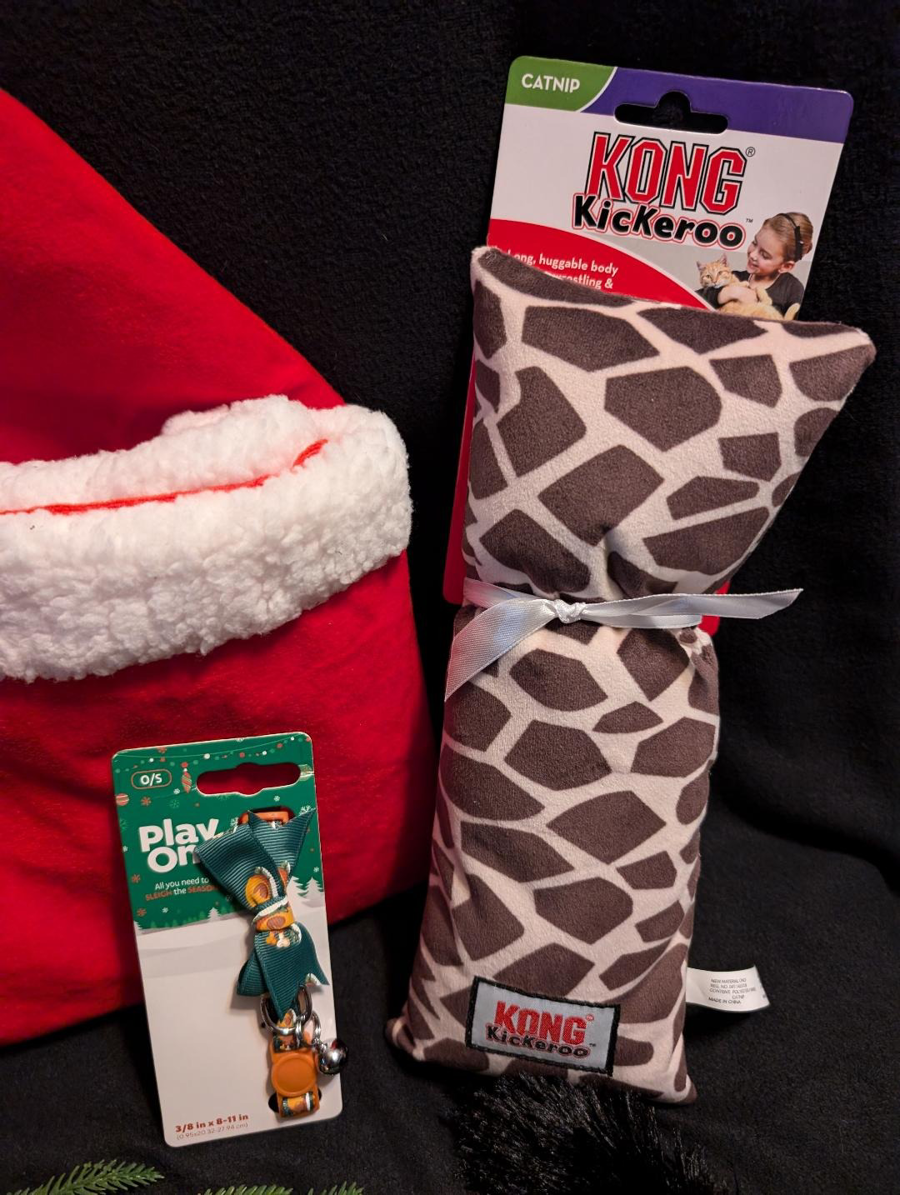 Includes a Velvety Crinkle Santa Hat Toy kitty can climb in and crinkle away (they love that crinkle sound), a Kong Kickaroo, and a holiday cat collar! Comes in a gift bag ready to put under the tree! MEOW~meow~MEOW