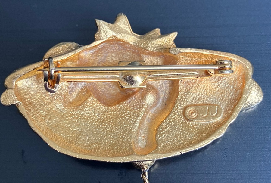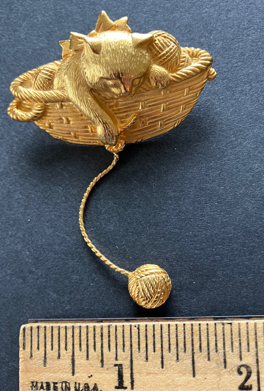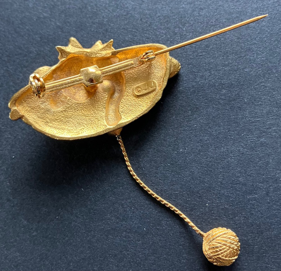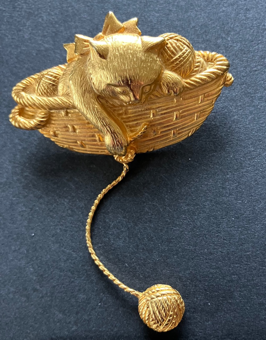 From the JJ (Jonette Jewelry) collection, this whimsical goldtone pin depicts a cat snuggled in a basket, playing with a dangling ball of yarn. Pre-owned, in good condition.