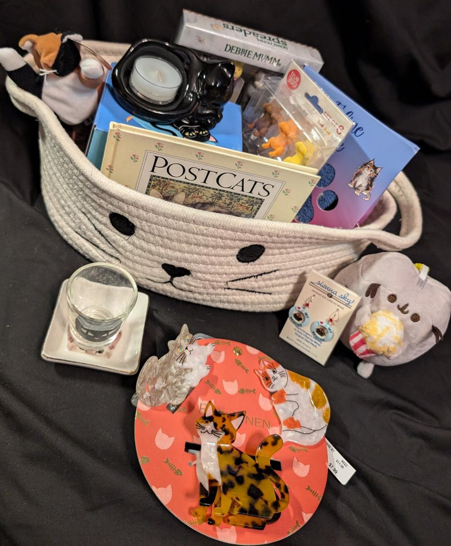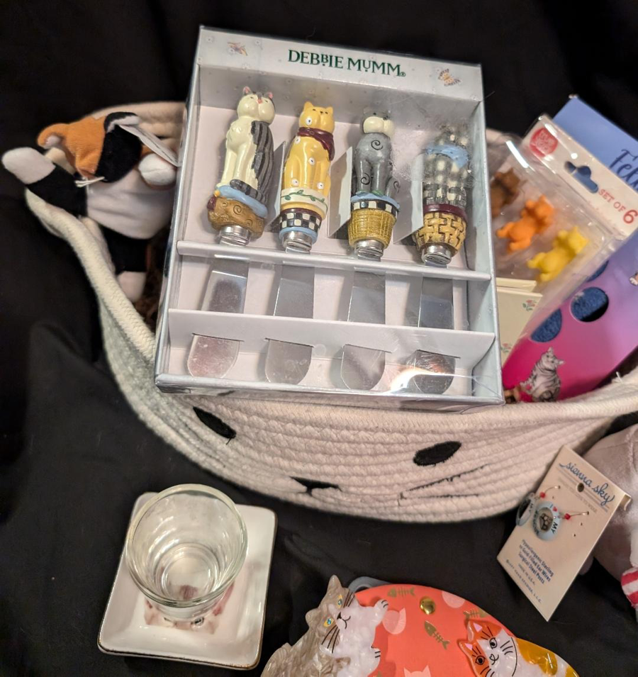 Full of fun items for the cat lover......includes a rope cat basket, a Cat-titude coffee cup, I love my rescue cat ear rings, cat hair clips, black cat ceramic tea light holder, cat cheese spreaders by Debbie Mumm, silicone cat markers, cat socks, mini Ty cat, and a cat book. Everything for the cat lover........MEOW meow MEOW meow