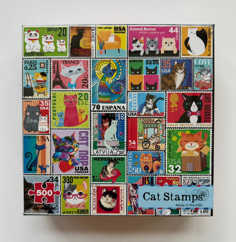 A puzzle featuring cat stamps from around the world. 500 pieces.