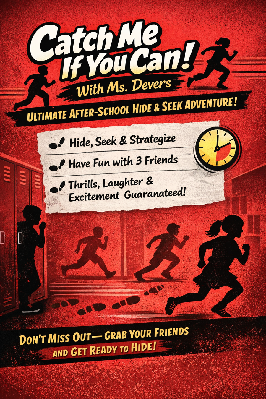 Bring three friends for the ultimate after-school hide-and-seek adventure with Ms. Devers! Dash through the school, find the best hiding spots, and enjoy a thrilling game full of laughs, teamwork, and surprises. After all the action, celebrate your victories with a tasty pizza reward—the perfect way to refuel and share fun memories with friends. This experience is all about tag, strategy, and laughter, with pizza as the delicious bonus at the finish!