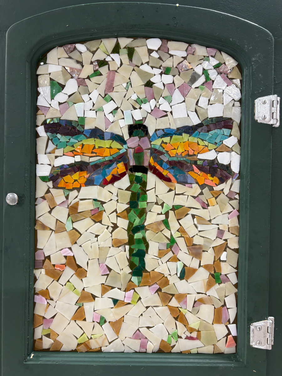 This antique hoosier cabinet was restored into an incredible work of art by our Voyager class. After stripping and sanding, they created a gorgeous dragonfly glass mosaic and added a batik curtain.