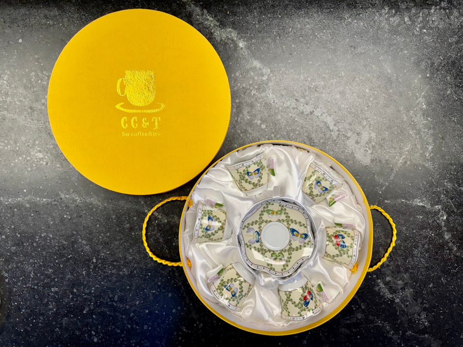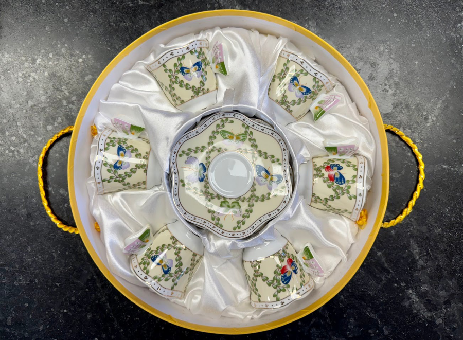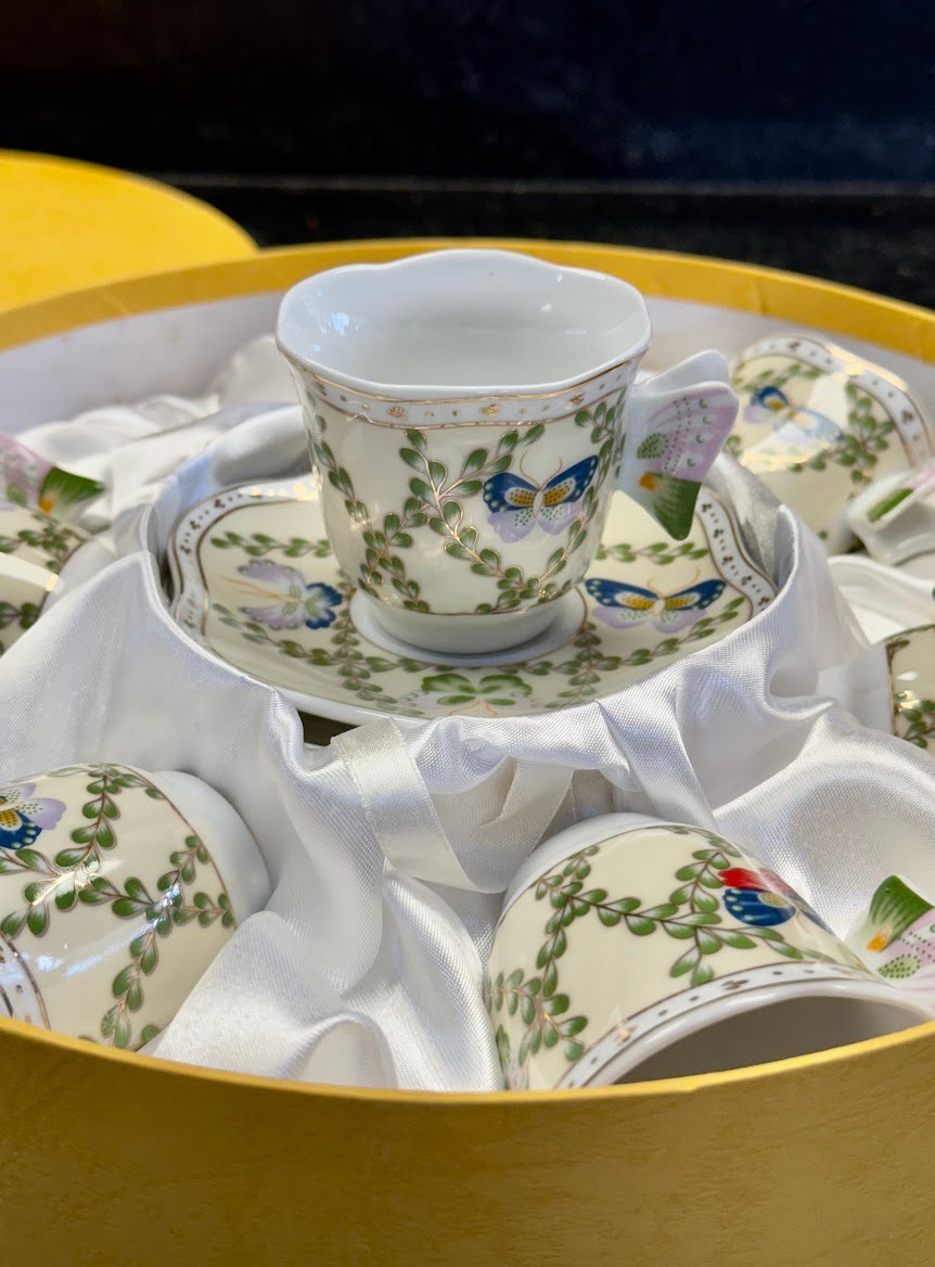 Vintage CC&T set for coffee or tea in a floral and butterfly pattern. Each cup has a butterfly handle! The set includes 6 cups and saucers in original case for storage.