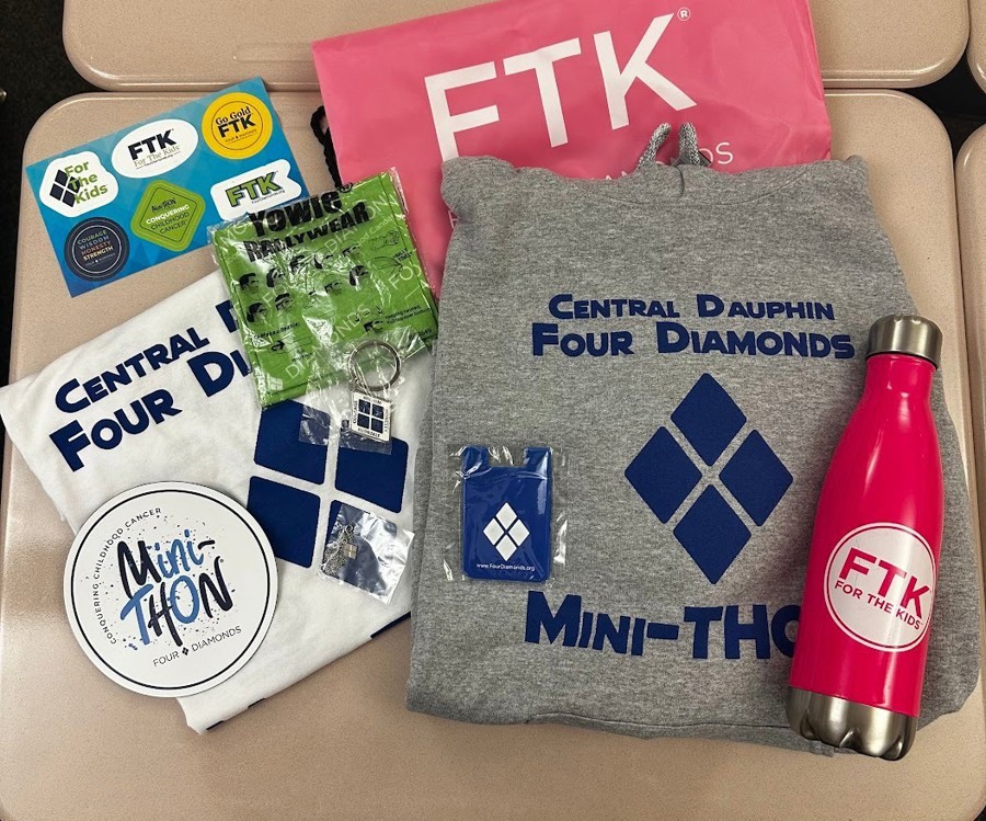 CDHS Four Diamonds Basket includes: t-shirt (medium), hoodie (medium), car magnet, metal water bottle, necklace, metal keychain, stickers, yowie, phone card holder, and drawstring bag Donated by: CDHS Four Diamonds