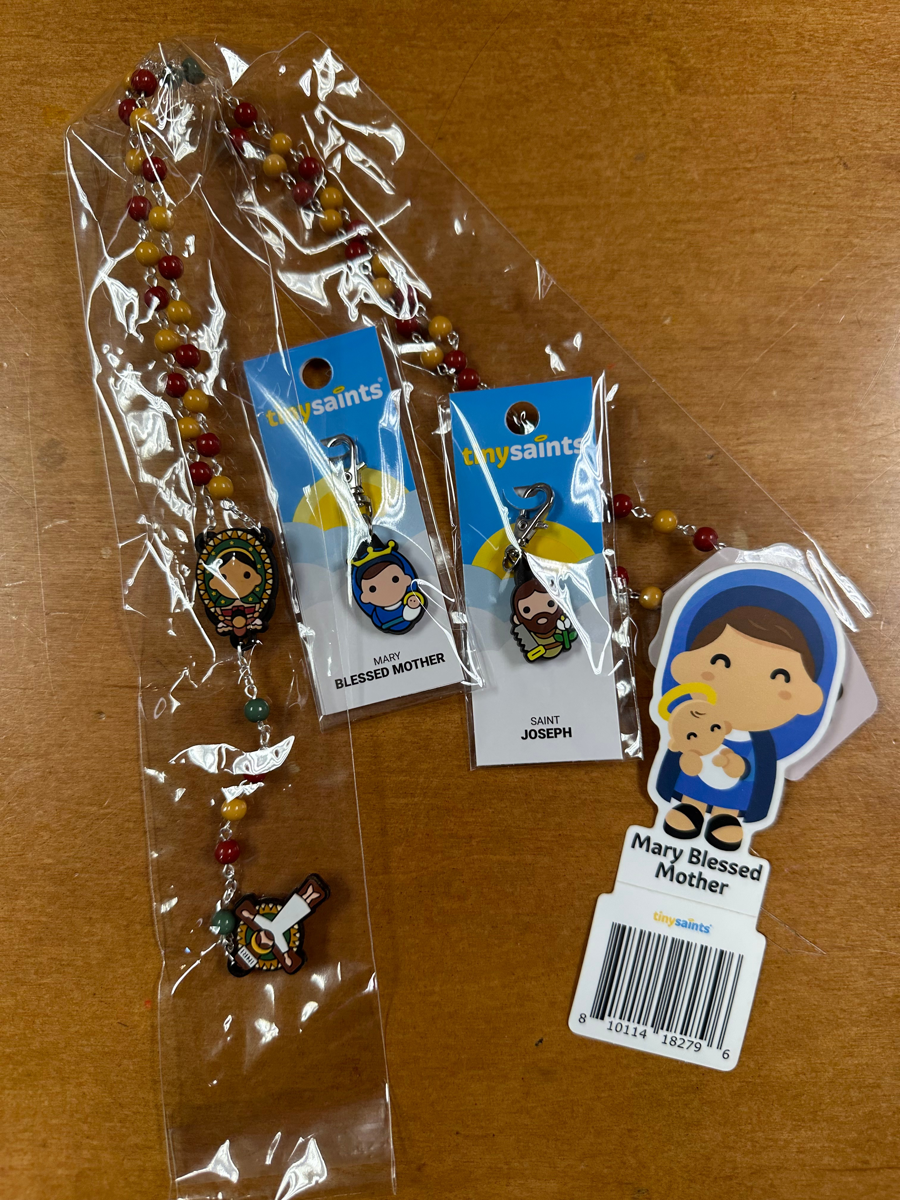 This beautiful package in honor of Mary includes a tiny saint of her and Saint Joseph, an Our Lady of Guadalupe rosary, and a Mary sticker.