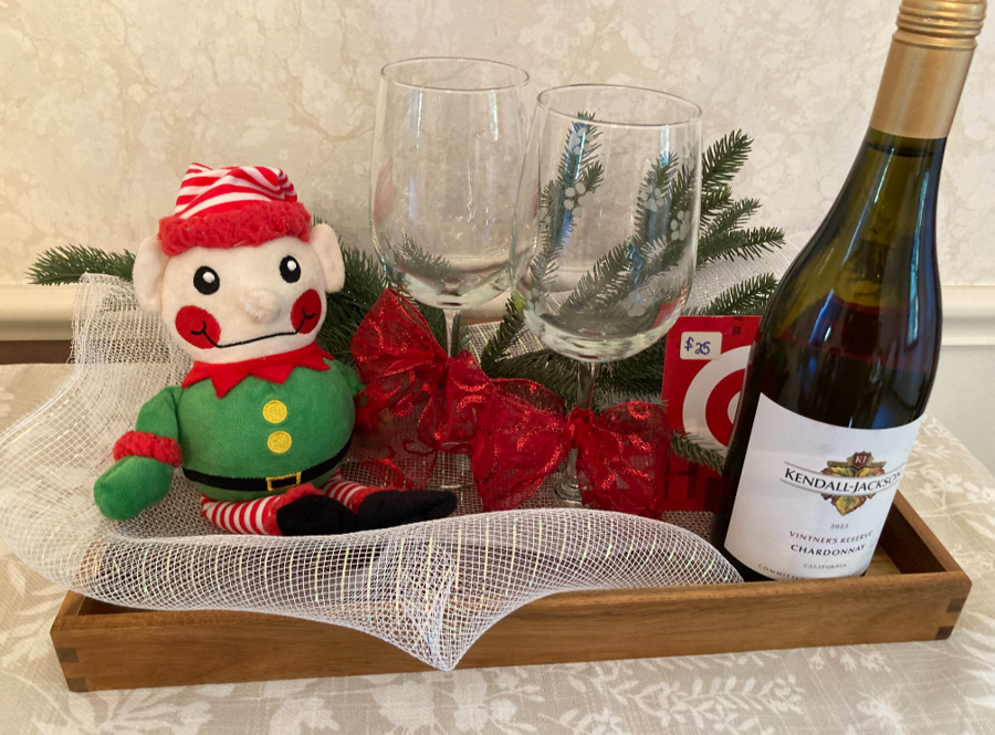 Includes: (1) teak wood serving tray (1) bottle of Kendall-Jackson 2023 Vintner's Reserve Chardonnay (2) wine glasses with custom etched paw prints (1) elf dog toy (1) gift card to Target $25