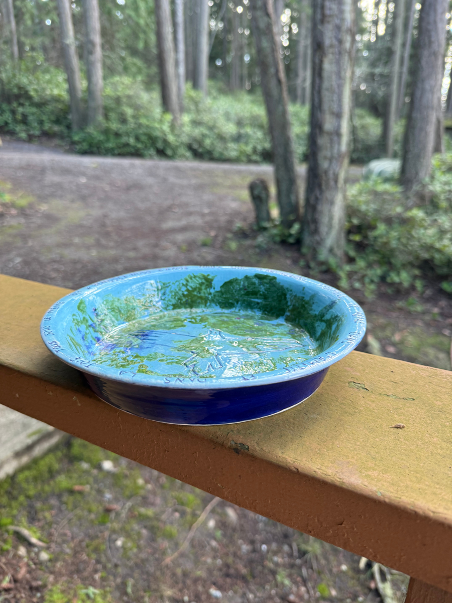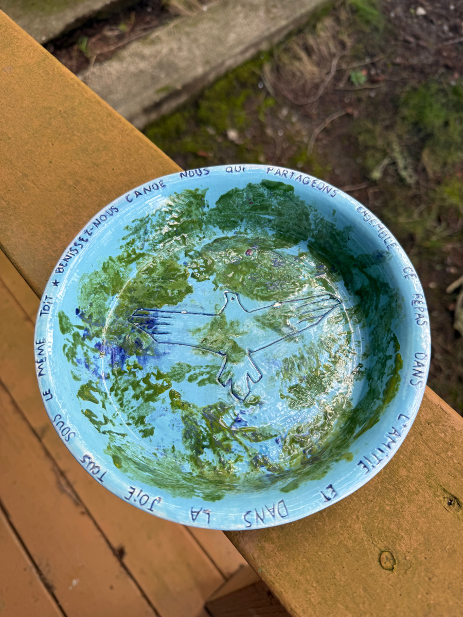 This beautiful bowl features CIFC's new logo aglow with the blues and greens of Canoe Island. La benediction encircles the rim of the bowl, making this the perfect CIFC keepsake. It was made by CIFC medical professional Sarah Keating. The bowl measures 8.5" by 1.5".