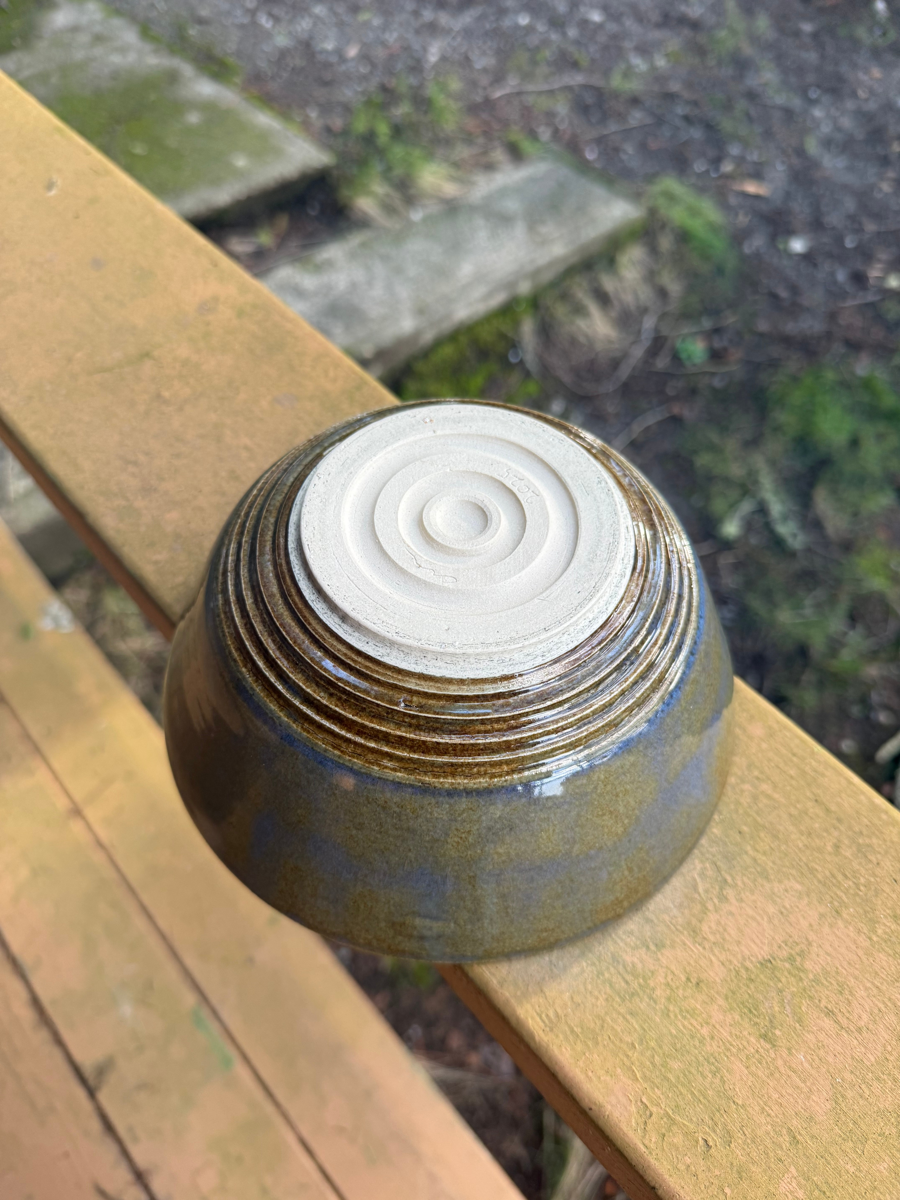 This lovely bowl, thrown by Connor Stockton, features a flowing blue interior and scuptural lines at the base. It measures 7.5" by 4".