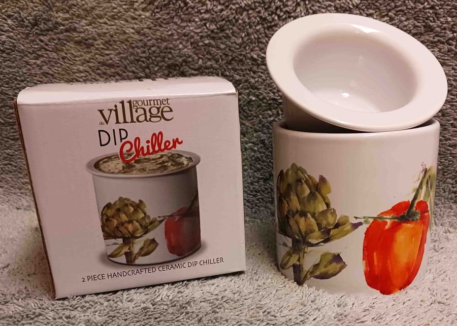 2-piece handcrafted ceramic Gourmet Village Dip Chiller. A nice serving bowl designed to keep dips and condiments cool and fresh for hours by using an integrated ice chamber. Features a two-part design where ice is placed in the lower dish to chill the upper bowl containing the dip.