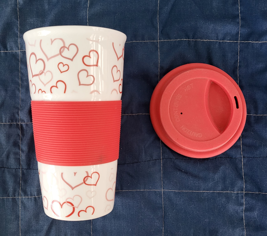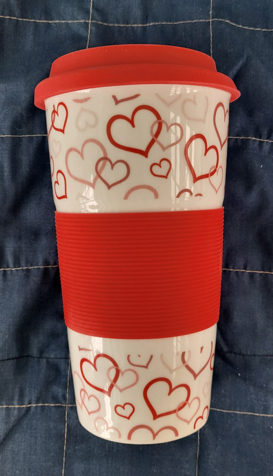 Sweet heart themed ceramic tumbler with silicone lid. Measures about 7.5" tall x 3.5" diameter.