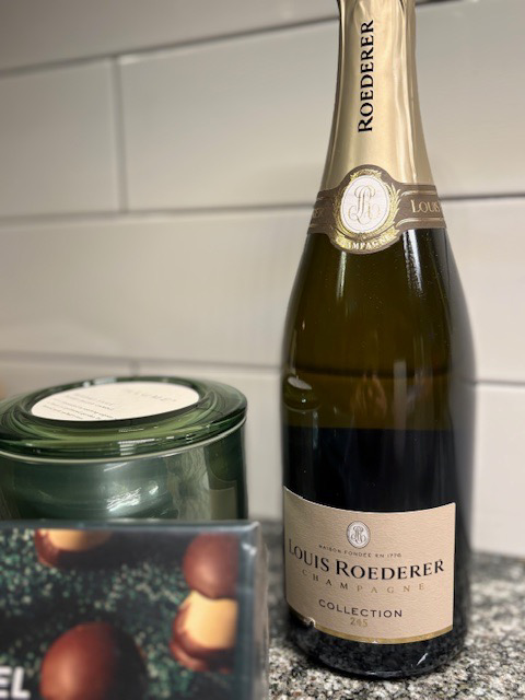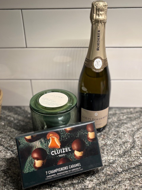 Includes a bottle of Louis Roederer champagne, a box of caramel, nougatine and chocolate mushrooms and a Illume candle (Hinoki sage, plant based candle, grounded in soothing cypress with a heart of gathered herbs kissed with salted citrus)