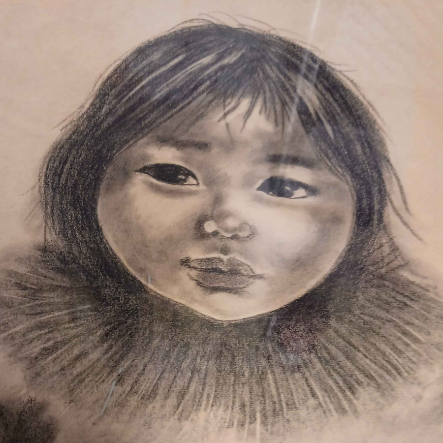 This is a framed original of an Inuit child, signed dm mest '79. The original artwork is a charcoal sketch. In very good condition, approx size 53 cm x 42 cm