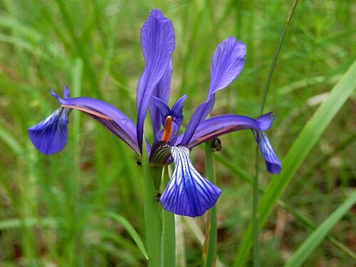 A dwarf spuria iris, with cream falls veined heavily with lavender-blue, standards are blue with violet base. The slender foliage, dark and glossy, stays through the winter. Moist but well drained soil. Sun/Pt Shade, 8"-12" x 12". Looks like a miniature Siberian iris. Zone 7