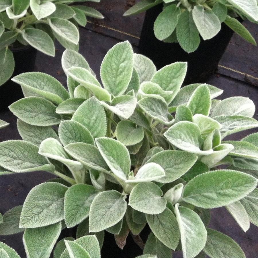 Compared to the common lamb’s Ears, this cultivar has larger hairy leaves that are not quite as grey, but it is said to be resistant to melting out in the muggy heat of summer. It also produced fewer flower spikes, which some people consider to be a good thing! Syn: ‘Big Ears’