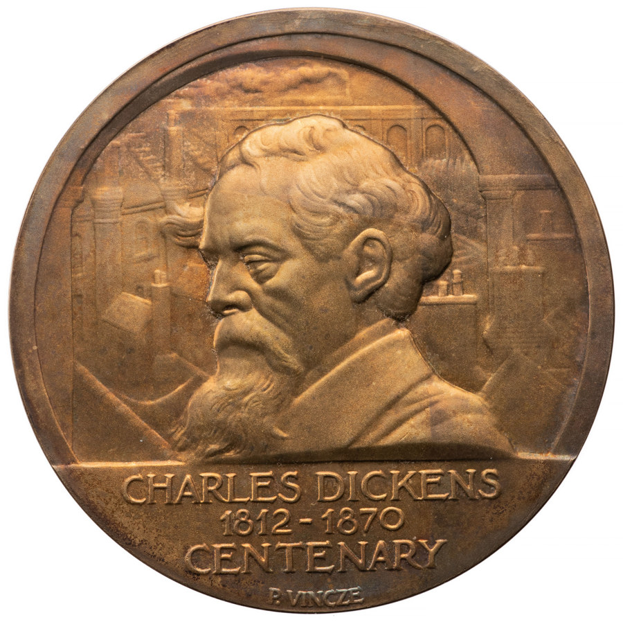 Charles Dickens (1812-1870) was one of the most prominent authors of the Victorian era, best known for works such as A Christmas Carol and Great Expectations. This silver medal, commemorating the 100th anniversary of Dickens' death, was created by medallist Paul Vincze (1907-1994), a Hungarian artist who flourished in Great Britain after fleeing Nazi persecution in 1938. The medal measures 2.5" in diameter, contains 120 grams of sterling silver, and was struck by The Royal Mint. * Following the auction, winners will receive an invoice for their winning bid and shipping costs.