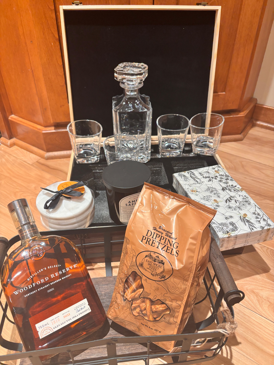 Introducing the Chaska Glass & Whisky Bundle, a perfect addition to your home for a more casual entertaining experience. This exquisite set features a beautifully etched decanter along with four elegant etched Chaska glasses, designed to enhance your whiskey enjoyment. Imagine savoring your favorite (included bottle) of Woodford Reserve in these stylish glasses, while hosting your favorite people. To elevate your gatherings, serve drinks on chic marble coasters, complemented by delicious dipping pretzels and charming napkins. And to create a warm ambiance, light the delightful amber saffron candle included in the bundle. This package is ideal for those who appreciate the finer things in life while enjoying a relaxed atmosphere with friends and family.