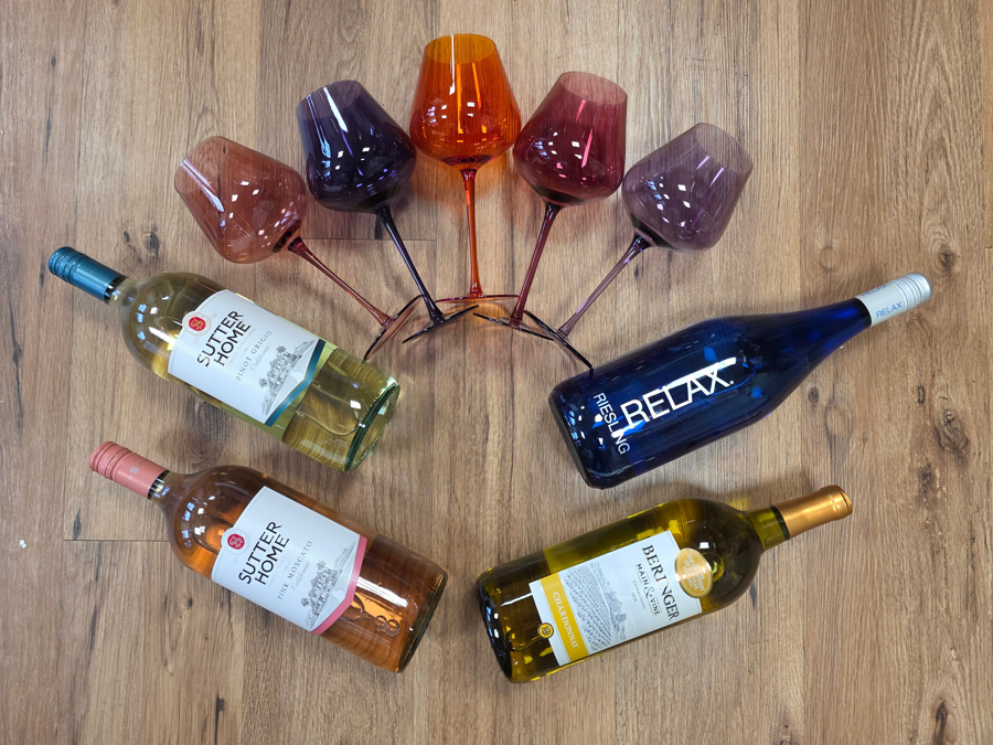 Cheers to you and your friends with these beautiful wine glasses. Includes: 5 colorful wine glasses Sutter Home 1.5L Pinot Grigo Sutter Home 1.5L Pink Moscato Beringer Chardonnay 1.5L RELAX Riesling 1.5L