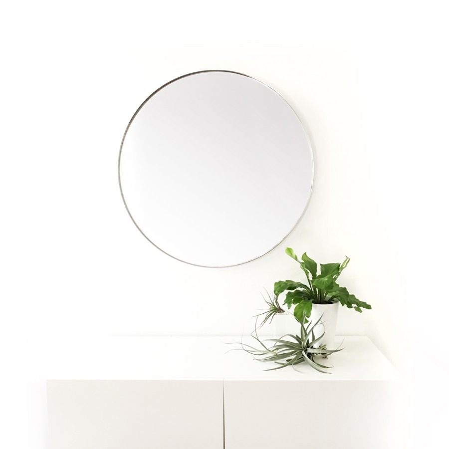 Introducing this stunning round circular modern stainless steel mirror by Notorious Badger, a perfect addition to any home decor. This sleek and stylish mirror features a 20 inch diameter and a 1.4” thick frame, making it an eye-catching focal point for your entryway, hallway, living room, or bathroom. Weighing only 8 lbs, it's easy to mount and ideal for various wall spaces. Enhance your interior with this elegant modern stainless steel mirror that combines functionality with contemporary design.