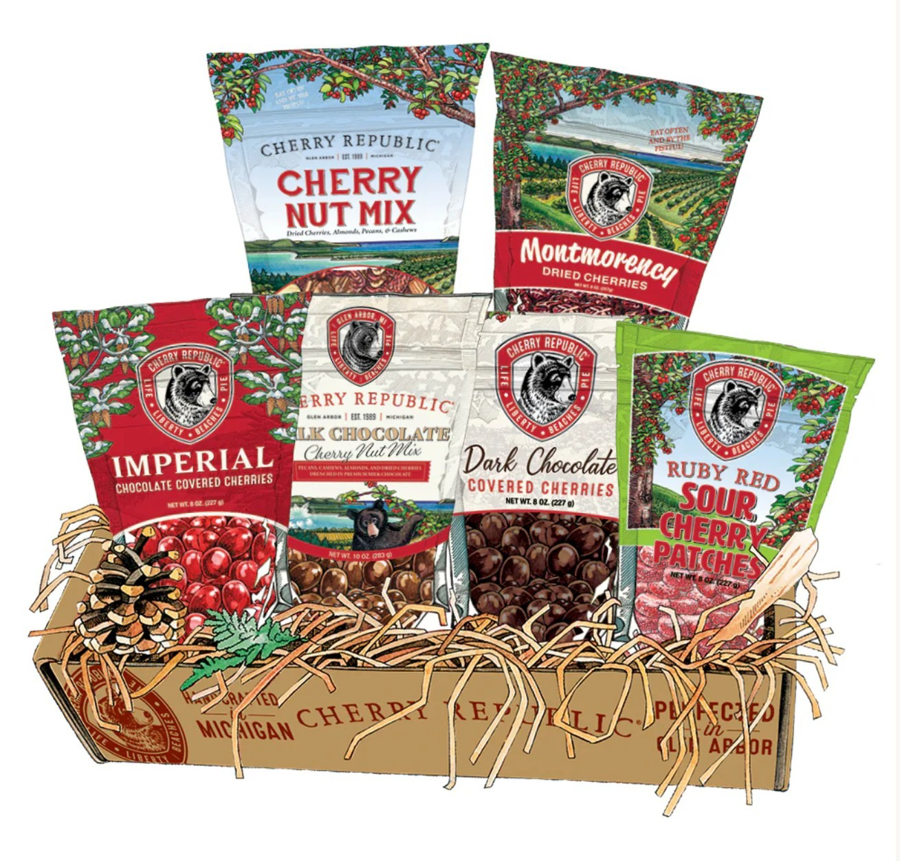 Spread the Cherry Cheer! This popular gift box is sure to brighten anyone's day, and giving it away is sure to brighten yours, too. Gift Box Contains: Imperial Chocolate Covered Cherries - Cherry Nut Mix - Milk Chocolate Covered Cherry Nut Mix - Dark Chocolate Covered Cherries - Ruby Red Sour Cherry Patches - Montmorency Dried Cherries