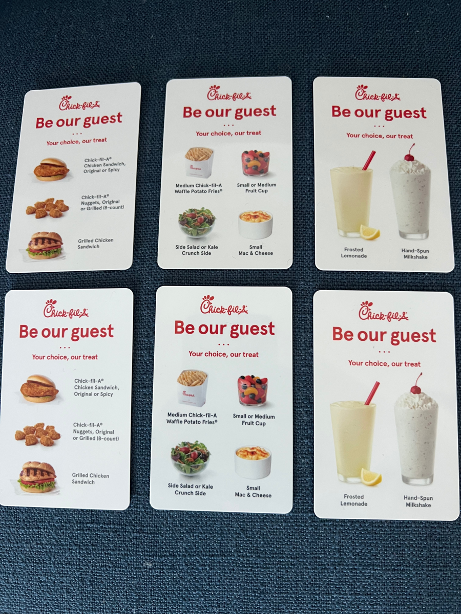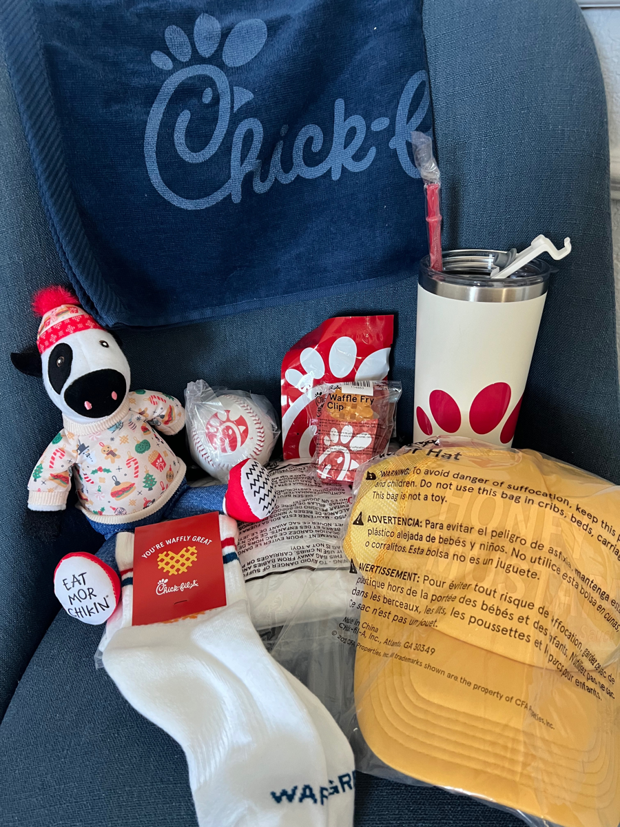 Enjoy everyone's favorite fast food! A Chick-fil-A bag with CFA branded items, including: Medium T-shirt, golf towel, baseball cap, water bottle, baseball, waffle fry claw clip, keychain, socks and plush cow. Also includes: (2) cards with your choice of: Medium Waffle Fries, Medium Fruit Cup, Side Salad or Kale Crunch Side or Small Mac & Cheese (Expires 6/30/26) (2) cards with your choice of: Chicken Sandwich, Original or Grilled Nuggets (8 count) or Grilled Chicken Sandwich (Expires 12/31/25) (2) cards with your choice of: Frosted Lemonade or Hand-Spun Milkshake (Expires 12/31/25) $175 value