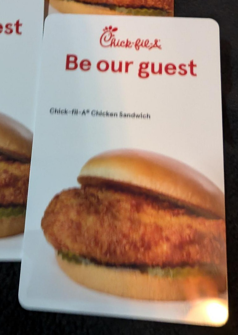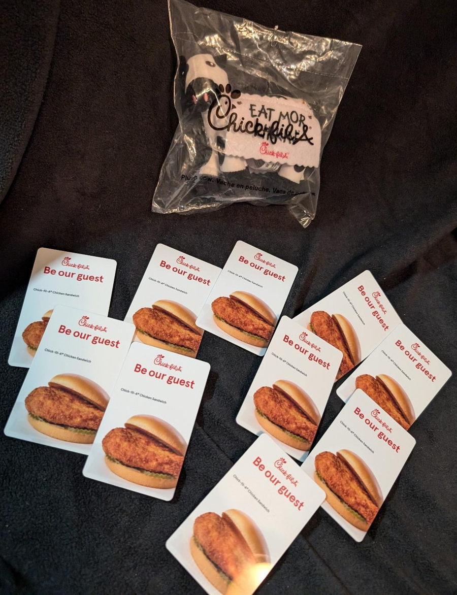 Includes 10 gift cards for 10 free chicken sandwiches and a cute Chick~fil~A moomoo cow stuffed toy for the youngster. The best chicken sandwiches and customer service around!